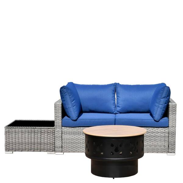 Sanibel Gray 4-Piece Wicker Outdoor Patio Conversation Sofa Set with a Wood-Burning Fire Pit and Navy Blue Cushions