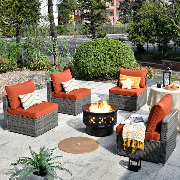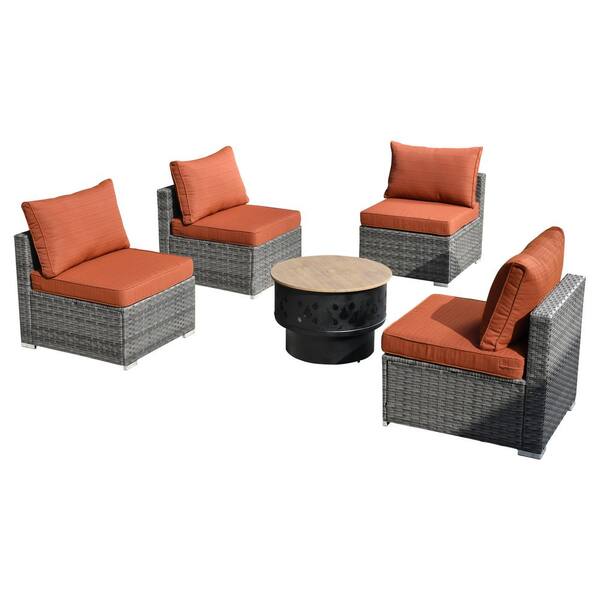 Sanibel Gray 5-Piece Wicker Outdoor Patio Conversation Sofa Set with a Wood-Burning Fire Pit and Orange Red Cushions