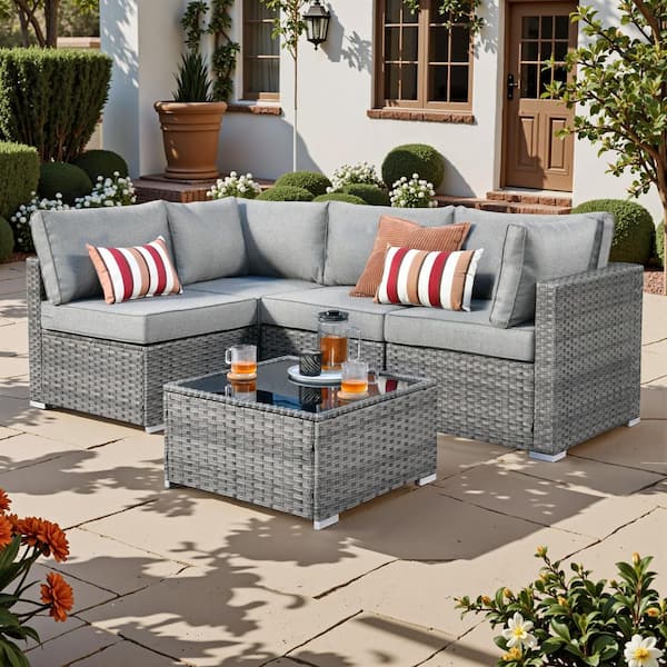 Sanibel Gray 5-Piece Wicker Patio Conversation Sofa Sectional Set with Dark Gray Cushions