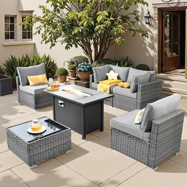 Sanibel Gray 6-Piece Wicker Outdoor Patio Conversation Sofa Sectional Set with a Metal Fire Pit and Dark Gray Cushions