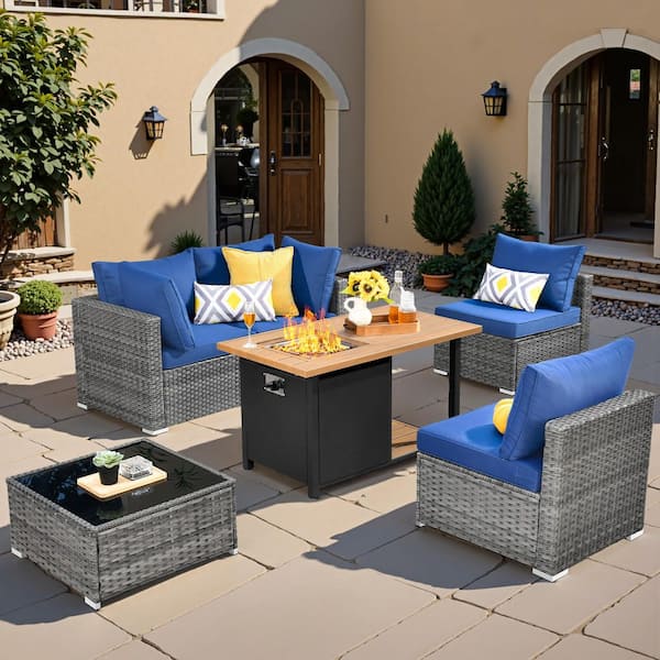 Sanibel Gray 6-Piece Wicker Outdoor Patio Conversation Sofa Sectional Set with a Storage Fire Pit and Navy Blue Cushions