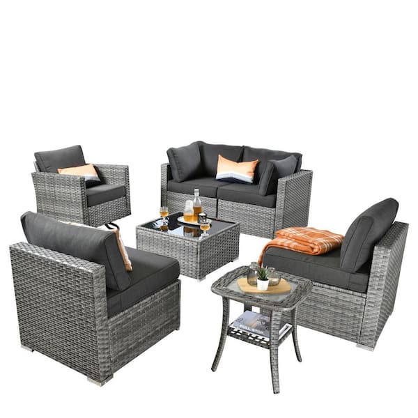 Sanibel Gray 7-Piece Wicker Patio Conversation Sofa Sectional Set with a Swivel Chair and Black Cushions