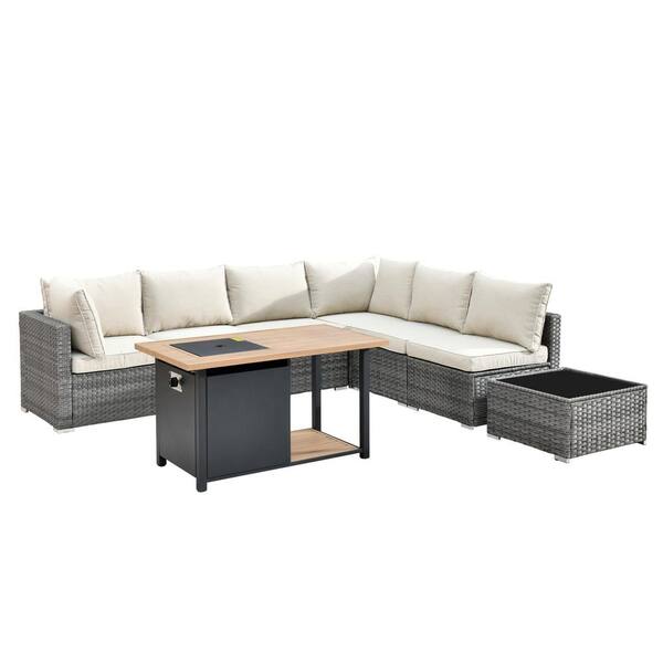 Sanibel Gray 8-Piece Wicker Outdoor Patio Conversation Sofa Seating Set with a Storage Fire Pit and Beige Cushions