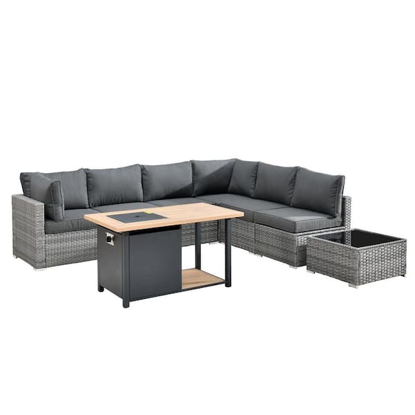 Sanibel Gray 8-Piece Wicker Outdoor Patio Conversation Sofa Seating Set with a Storage Fire Pit and Black Cushions