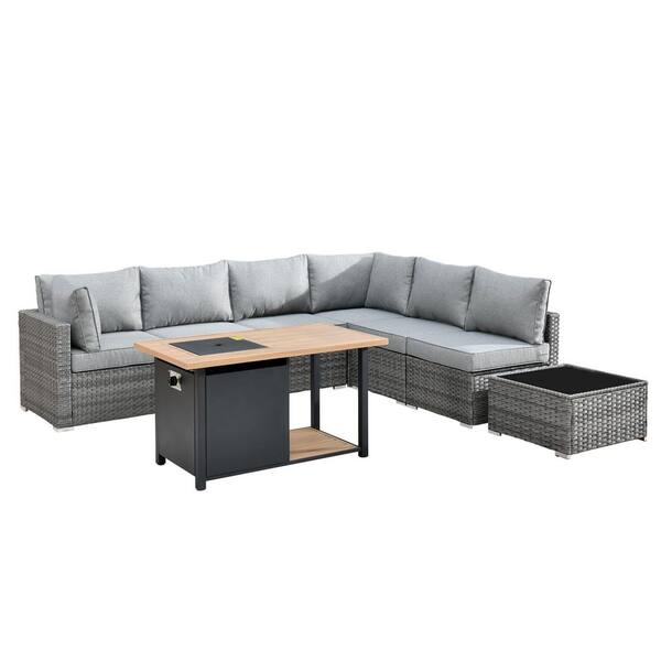 Sanibel Gray 8-Piece Wicker Outdoor Patio Conversation Sofa Seating Set with a Storage Fire Pit and Dark Gray Cushions