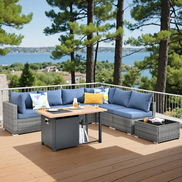 Sanibel Gray 8-Piece Wicker Outdoor Patio Conversation Sofa Seating Set with a Storage Fire Pit and Denim Blue Cushions