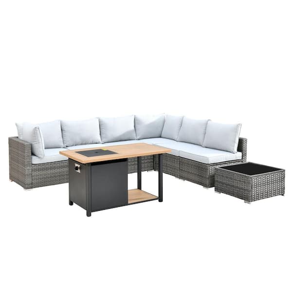 Sanibel Gray 8-Piece Wicker Outdoor Patio Conversation Sofa Seating Set with a Storage Fire Pit and Light Gray Cushions
