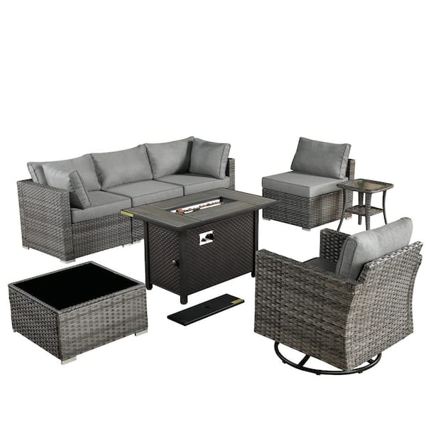 Sanibel Gray 8-Piece Wicker Outdoor Patio Conversation Sofa Sectional Set with a Metal Fire Pit and Dark Gray Cushions