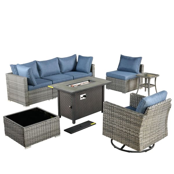 Sanibel Gray 8-Piece Wicker Outdoor Patio Conversation Sofa Sectional Set with a Metal Fire Pit and Denim Blue Cushions