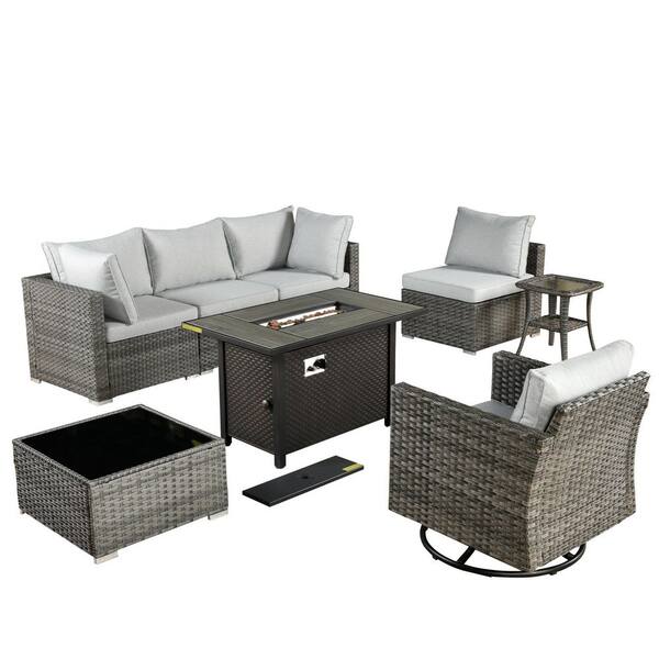 Sanibel Gray 8-Piece Wicker Outdoor Patio Conversation Sofa Sectional Set with a Metal Fire Pit and Light Gray Cushions