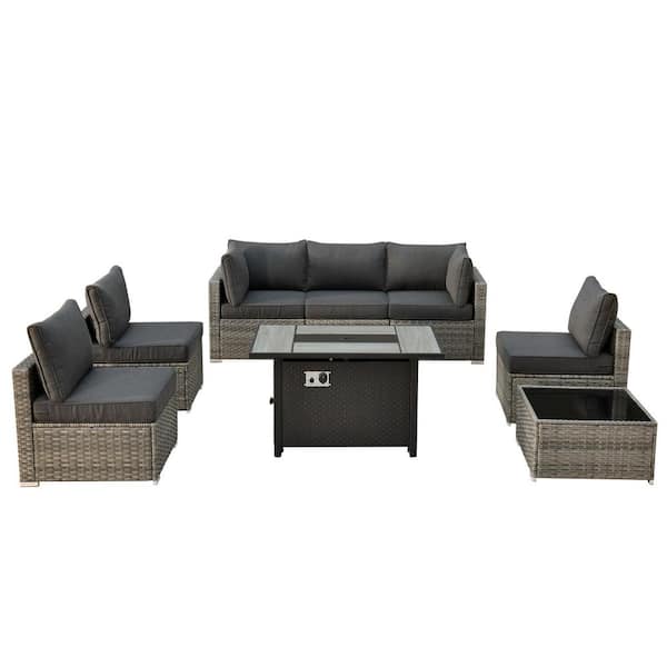 Sanibel Gray 8-Piece Wicker Patio Conversation Sofa Sectional Set with a Metal Fire Pit and Black Cushions