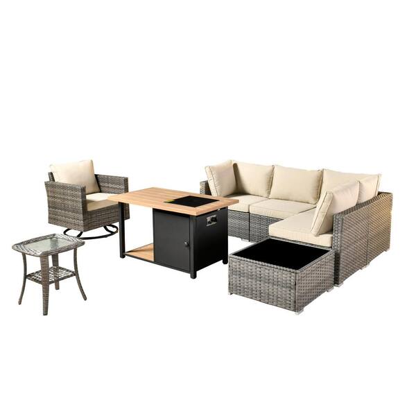 Sanibel Gray 8-Piece Wicker Patio Conversation Sofa Set with a Swivel Chair, a Storage Fire Pit and Beige Cushions