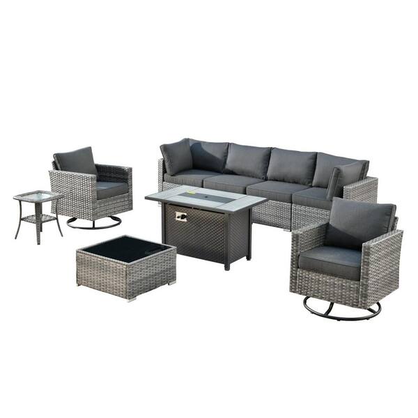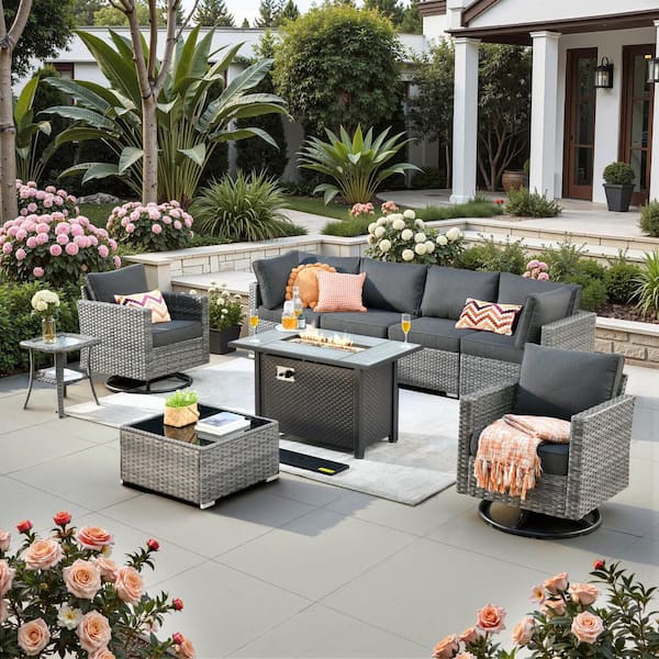 Sanibel Gray 9-Piece Wicker Outdoor Patio Conversation Sofa Sectional Set with a Metal Fire Pit and Black Cushions