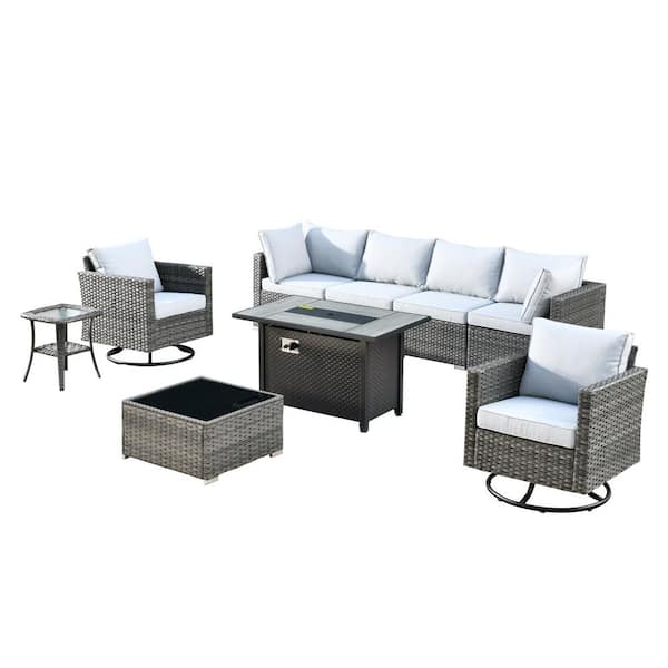 Sanibel Gray 9-Piece Wicker Outdoor Patio Conversation Sofa Sectional Set with a Metal Fire Pit and Light Gray Cushions