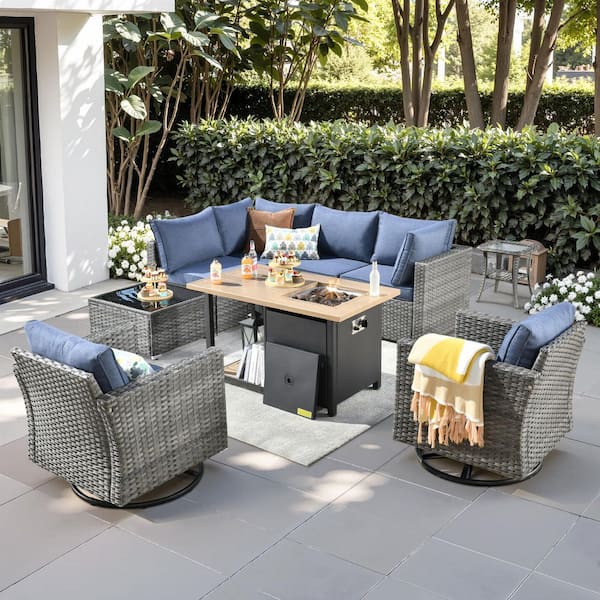 Sanibel Gray 9-Piece Wicker Outdoor Patio Conversation Sofa Set with a Storage Fire Pit and Denim Blue Cushions