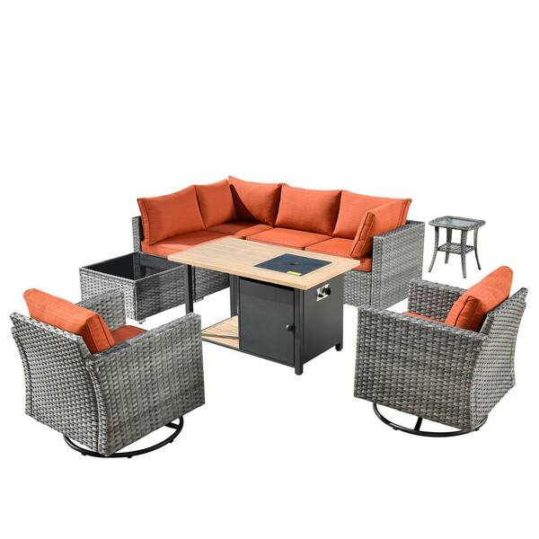Sanibel Gray 9-Piece Wicker Outdoor Patio Conversation Sofa Set with a Storage Fire Pit and Orange Red Cushions