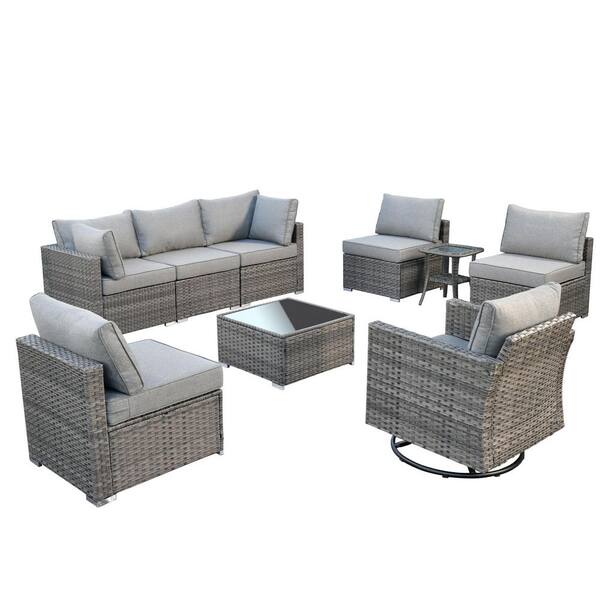 Sanibel Gray 9-Piece Wicker Outdoor Patio Conversation Sofa Set with a Swivel Rocking Chair and Dark Gray Cushions