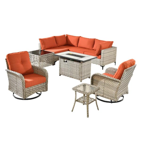 Savona 9-Piece Wicker Outdoor Patio Conversation Sectional Chair Set with Rectangular Fire Pit and Orange Red Cushions