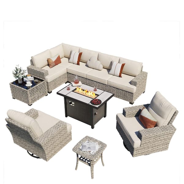 Torino 10-Piece Wicker Outdoor Patio Conversation Sofa Sectional Chairs Set with Metal Fire Pit and Beige Cushions