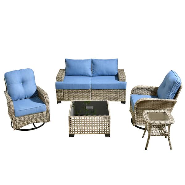 Torino Gray 6-Piece Modern Wicker Patio Conversation Deep Seating Set with Swivel Rocking Chairs and Blue Cushions
