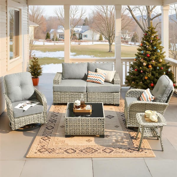 Torino Gray 6-Piece Modern Wicker Patio Conversation Deep Seating Set with Swivel Rocking Chairs and Dark Gray Cushions