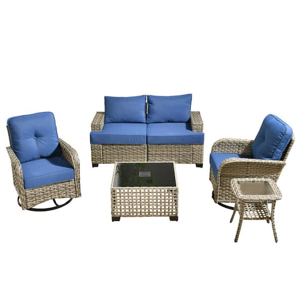 Torino Gray 6-Piece Modern Wicker Patio Conversation Deep Seating Set with Swivel Rocking Chairs and Navy Blue Cushions