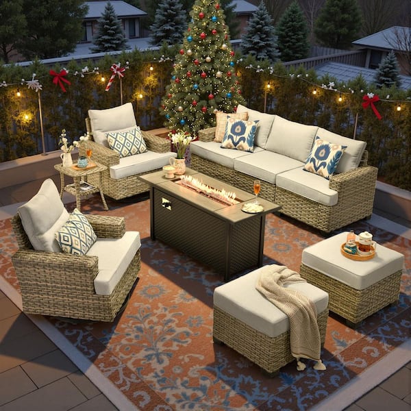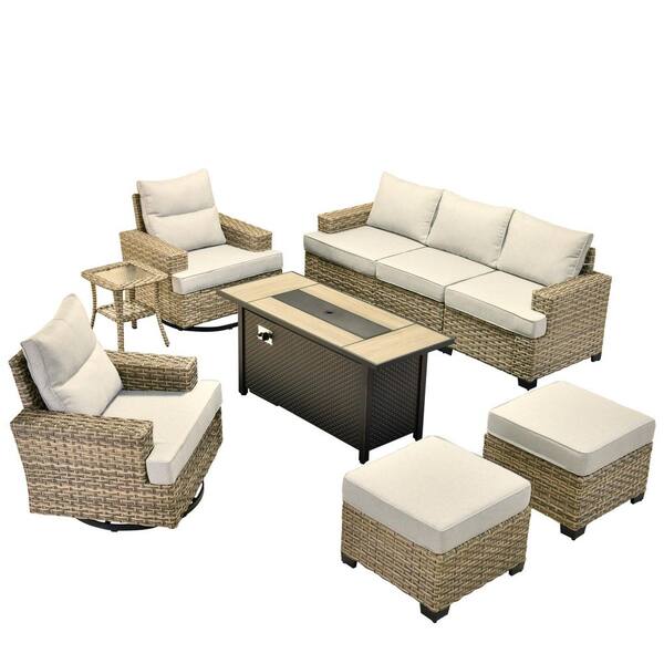 Torino Gray 9-Piece Wicker Outdoor Patio Conversation Deep Sofa Seating Set with Metal Fire Pit and Light Gray Cushions