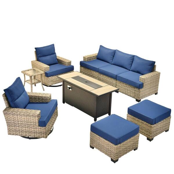 Torino Gray 9-Piece Wicker Outdoor Patio Conversation Deep Sofa Seating Set with Metal Fire Pit and Navy Blue Cushions