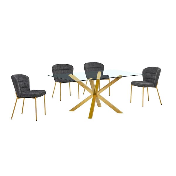 Tom 5-Piece Clear Glass Top Gold Stainless Steel Legs Dining Set with 4 Dark Grey Chairs