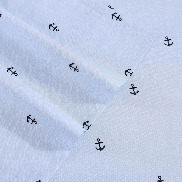 Anchor And Flag 4-Piece Pale Blue/White/Dark Blue Percale Cotton Queen Sheet Set