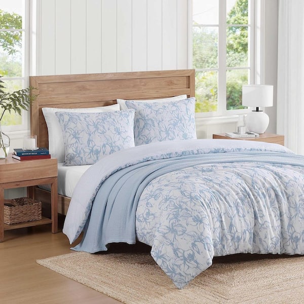 Ethereal Floral 2-Piece White/Soft Sky Blue Cotton Twin Duvet Cover Set