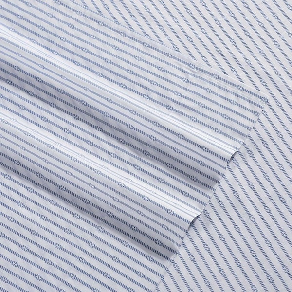 Monogram Stripe 4-Piece White/Pale Blue Cotton Queen Sheet Set