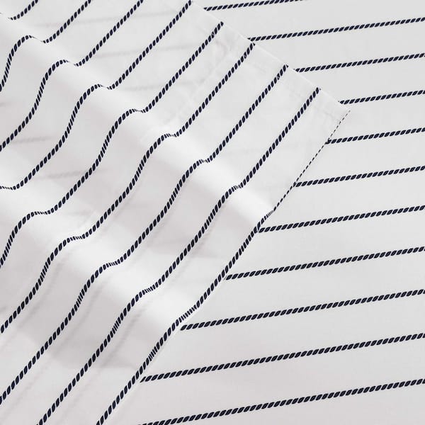 Rope Stripe 3-Piece White/Navy Blue Percale Cotton Twin Sheet Set