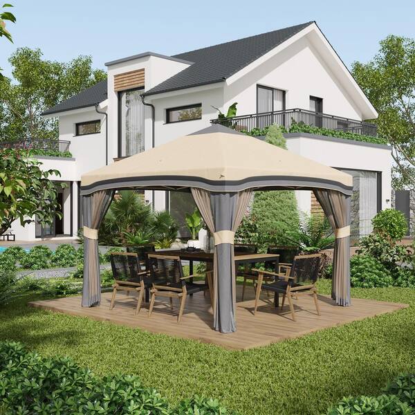 10 ft. x 10 ft. Beige Pop Up Canopy Tent with Netting, Instant Tent with Wheeled Carry Bag and 4 Sand Bags