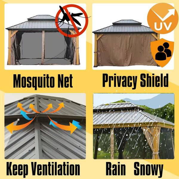 10 ft. x 12 ft. Brown Hardtop Gazebo Outdoor Aluminum Gazebos Grill with Galvanized Steel Double Canopy Curtains&Netting
