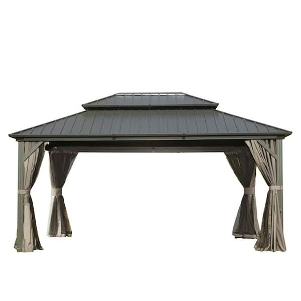 12 ft. x 14 ft. Gray Hardtop Gazebo, Aluminum Metal Gazebo with Galvanized Steel Double Roof Canopy, Curtain and Netting