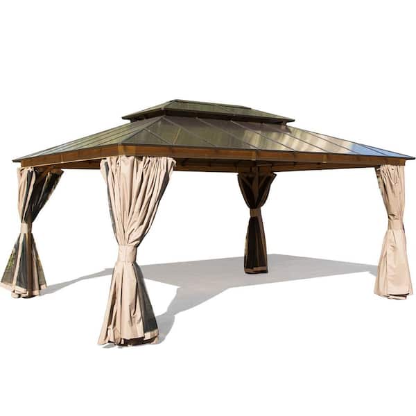 12 ft. x 16 ft. Wood Grain Aluminum Double Galvanized Steel Roof Gazebo with Ceiling Hook, Mosquito Netting and Curtains