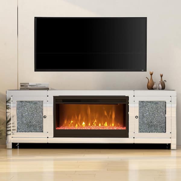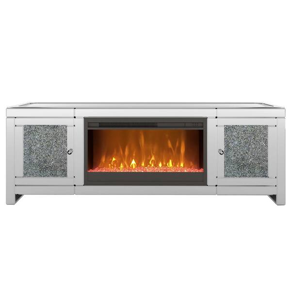 59 in. Freestanding Mirror Glass TV stand with Electric Eireplace, Crystal Decor Doors and Remote Control, Silver