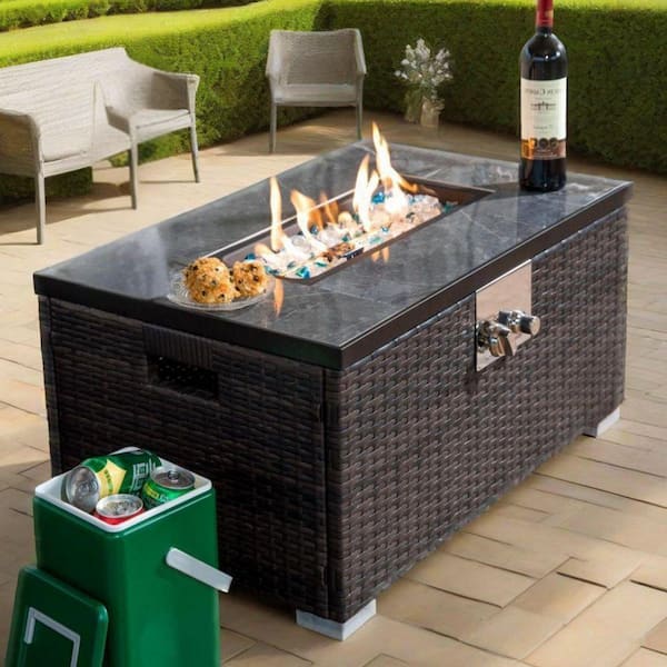 Brown Rectangular Wicker Outdoor Fire Pit Table with Glass Rocks, 40000 BTU
