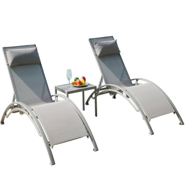 Set of 3 Adjustable Pool Lounge Chair Aluminum Outdoor Lounge Chairs with Metal Side Table All Weather in Gray