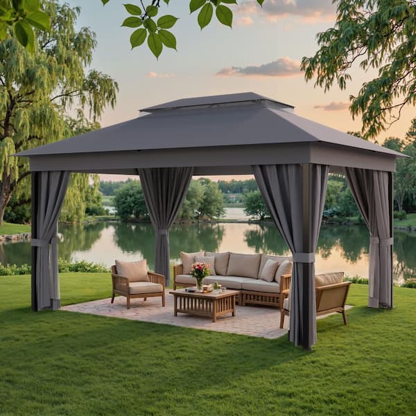 10 ft. x 13 ft. Gray Outdoor Steel Frame Gazebo with Mosquito Netting