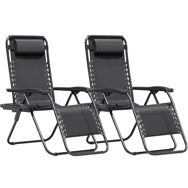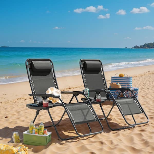 2-Piece Black Zero Gravity Black Metal Lawn Chair Set Adjustable Folding Beach Chair with Pillows and Cup Holders