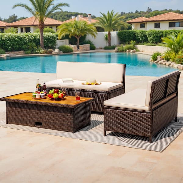 3-Piece Wicker Outdoor Dining Set with Liftable Table and Beige Cushions