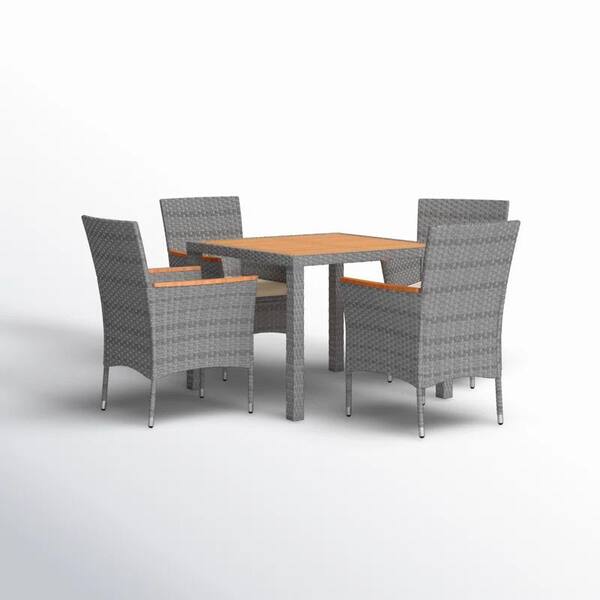 5-Piece Acacia Wood and Gray Wicker Outdoor Dining Set with Beige Cushions