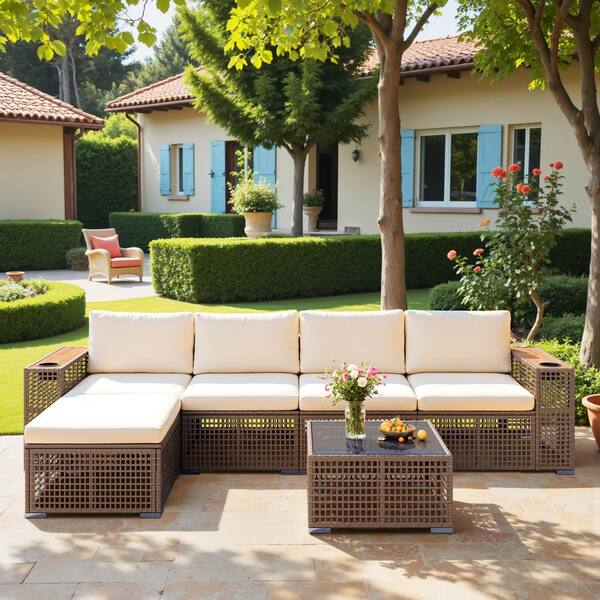6-Pieces Wicker Paito Conversation Set with White Cushions, Coffee Table and Ottoman