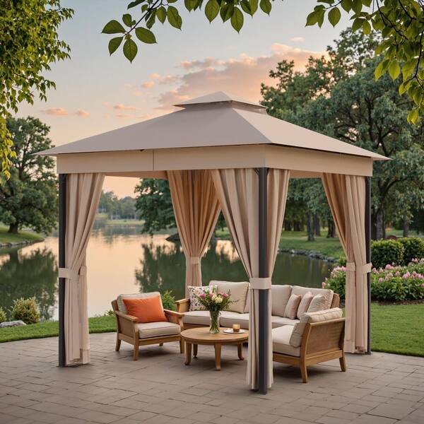 8 ft. x 8 ft. Khaki Outdoor Steel Frame Gazebo with Mosquito Netting