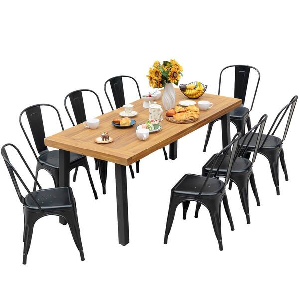 9-Piece Outdoor Dining Set Yellow Acacia Wood Table and 9 Metal Chairs