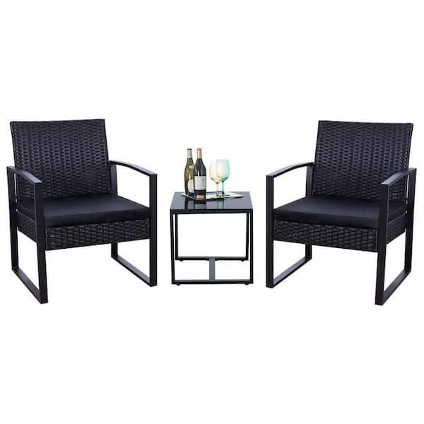 Black 3-Piece Steel Outdoor Wicker Patio Furniture Sets Outdoor Bistro Set with Black Cushion