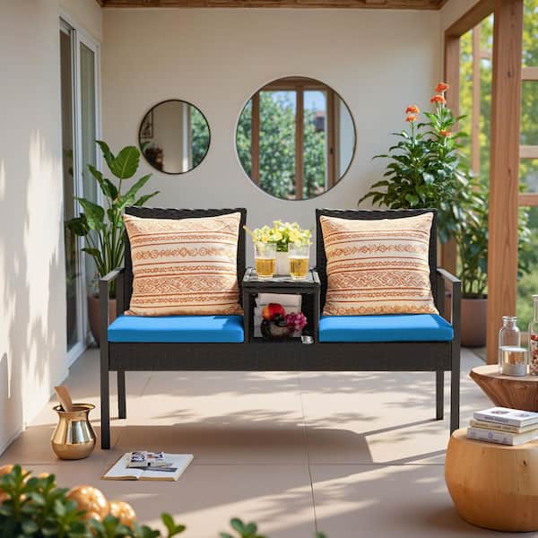 Morden Black 2-Person Wicker Outdoor Loveseat with Center Storage Table and Blue Cushions