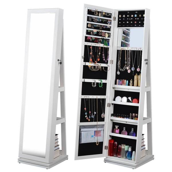 White 15.75 in. W x 60.15 in. H Rectangle Metal Full Length Mirror 360° Swivel Jewelry Cabinet